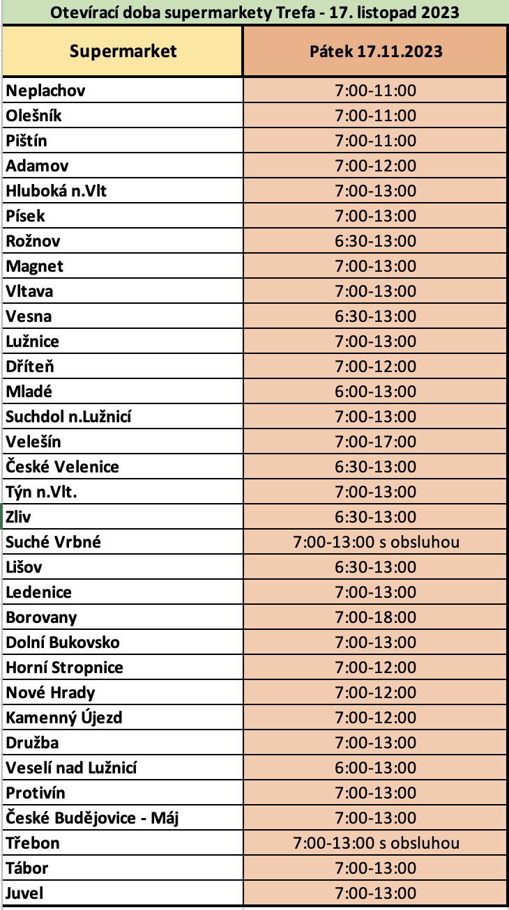 v pátek 17.11.2023 budou naše prodejny otevřeny. Než se k nám však vydáte👆🏻, zkontrolujte si v seznamu, do kolika má Vaše prodejna otevřeno – v tento den platí sváteční otevírací doba.